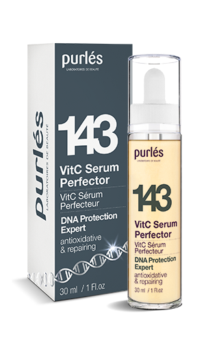 A beautifying serum for all skin types, especially mature skin with uneven tone. 10% Triple VitC System with three active forms of vitamin C (liposomal, stabilized, fresh) reduces the risk of DNA damage and highlights the skin. 5% Antioxidant Complex neutralizes free radicals, stimulates microcirculation and nourishes the skin. Anti-aging DNA-Protective Active protects the DNA of skin cells against the harmful IR and UVB radiation. Fine wrinkle smoothing and optimal hydration are provided by hyaluronic acid. Recommended for use with cream 144 VitC Cream Perfector. When used independently, it can cause gentle exfoliation of the epidermis.